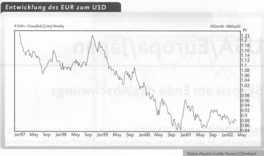 Anstieg des Euro auf 0,92 USD innerhalb der nächsten drei Monate. Quelle: Börsenreport, Oberbank, 04/2002